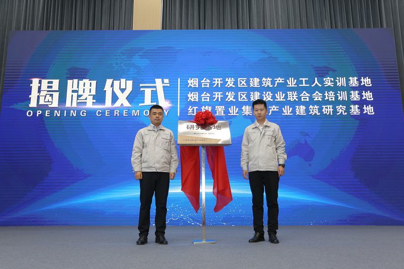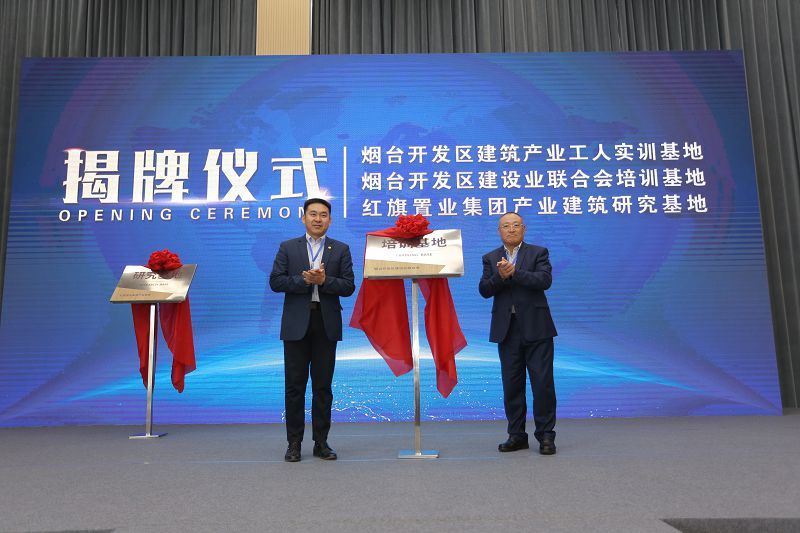 在揭牌仪式上,烟台开发区建设业联合会、红旗置业集团领导分别为烟台开发区建筑产业工人实训基地、烟台开发区建设业联合会培训基地、红旗置业集团产业建筑研究基地进行揭牌。